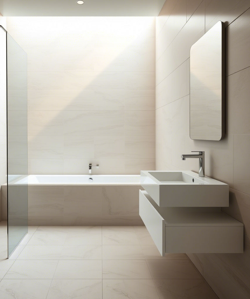 Les carreaux grand format offrent une allure contemporaine et permettent d’agrandir visuellement l’espace. Par ailleurs, moins de joints signifie aussi un nettoyage plus simple et moins de moisissures.