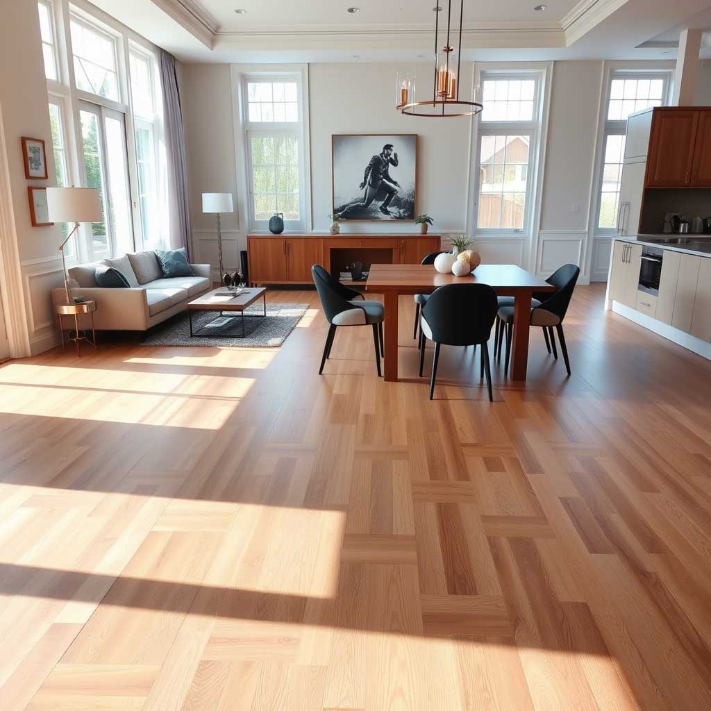 Installez des carreaux décoratifs sous la table à manger ou le canapé, entourés de parquet. Cela structure l’espace repas ou détente avec originalité.